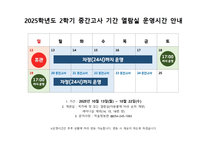 | ▶ 256 | 2025학년도 2학기 중간고사 기간 학술정보관 연장 운영 안내 | 강*름 | 2025-10-13 | 288 |