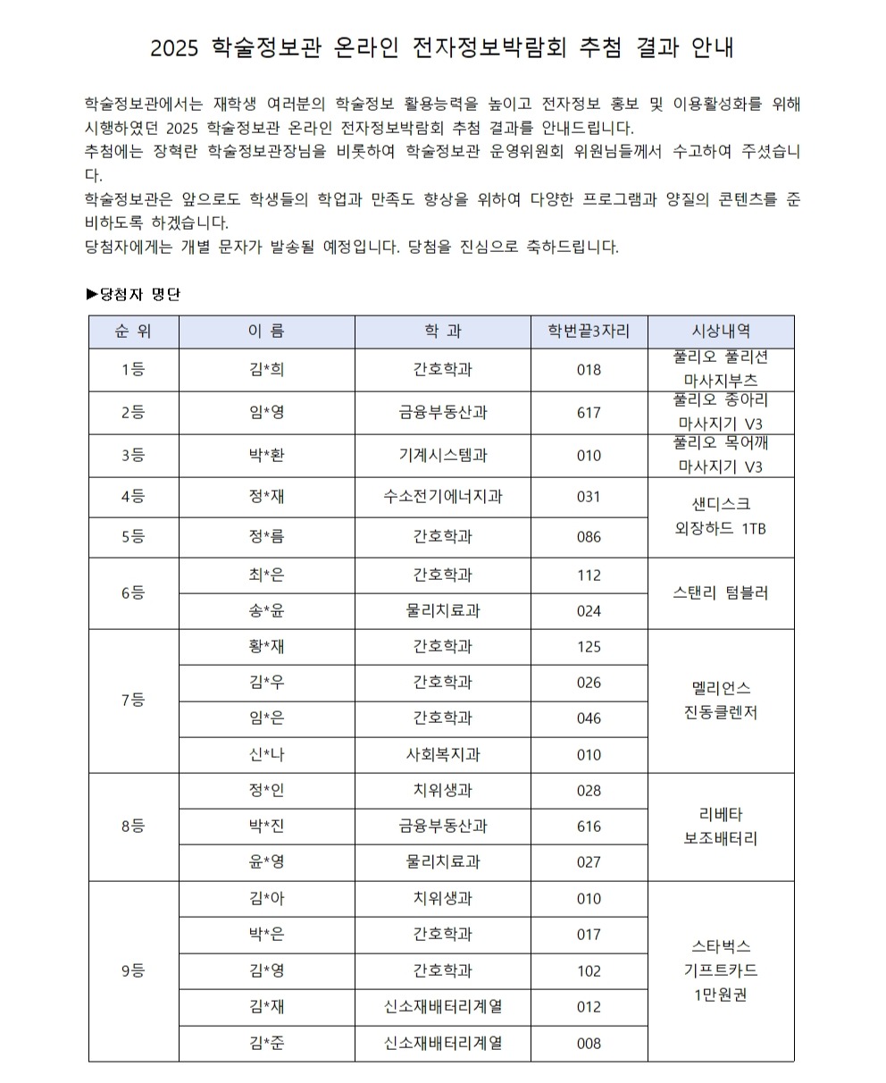2025 학술정보관 온라인 전자정보박람회 추첨 결과 안내