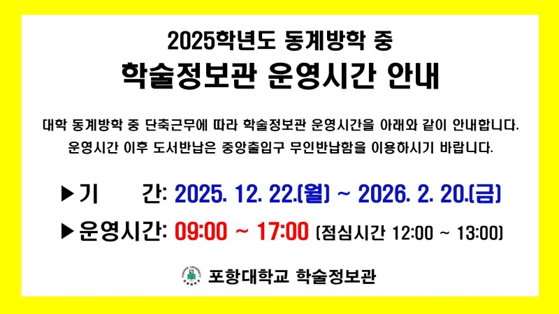 | ▶ 261 | 2025학년도 동계방학 중 학술정보관 이용시간 안내 | 강*름 | 2025-12-19 | 292 |